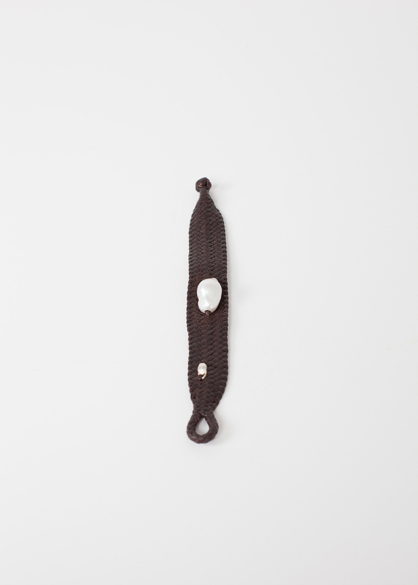 Kalosoma Jewelry demonstrates the rigorous beauty in the handmade. Braided leather acts as the canvas for an asymmetrical pearl. Scarab detail. Knotted closure. Color Brown. 100% Leather. Made in Mexico. Length 7 1/2 inches.