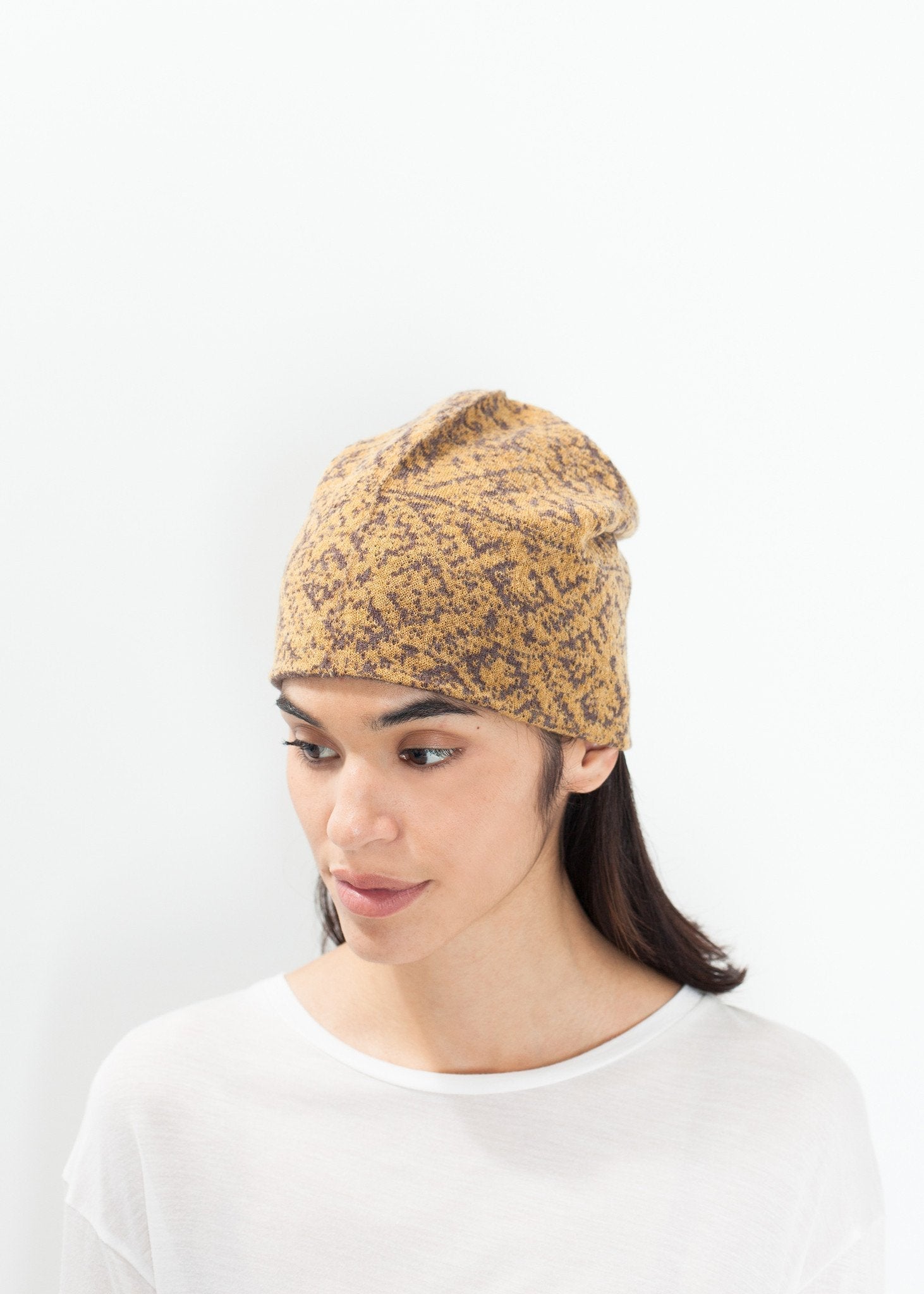 A versatile striped beanie is upturned to reveal an abstract pattern. Epice. Colors Amber. 100% Wool. One Size.